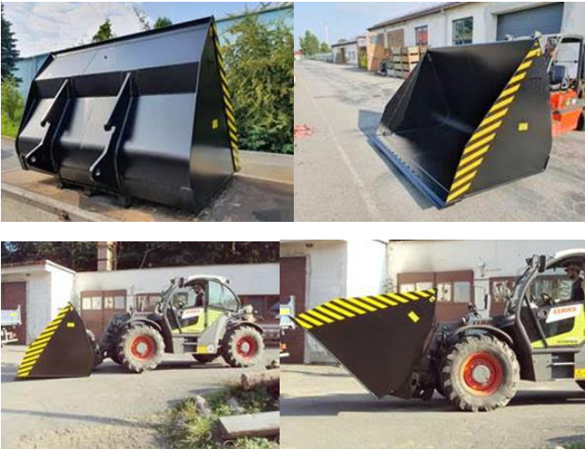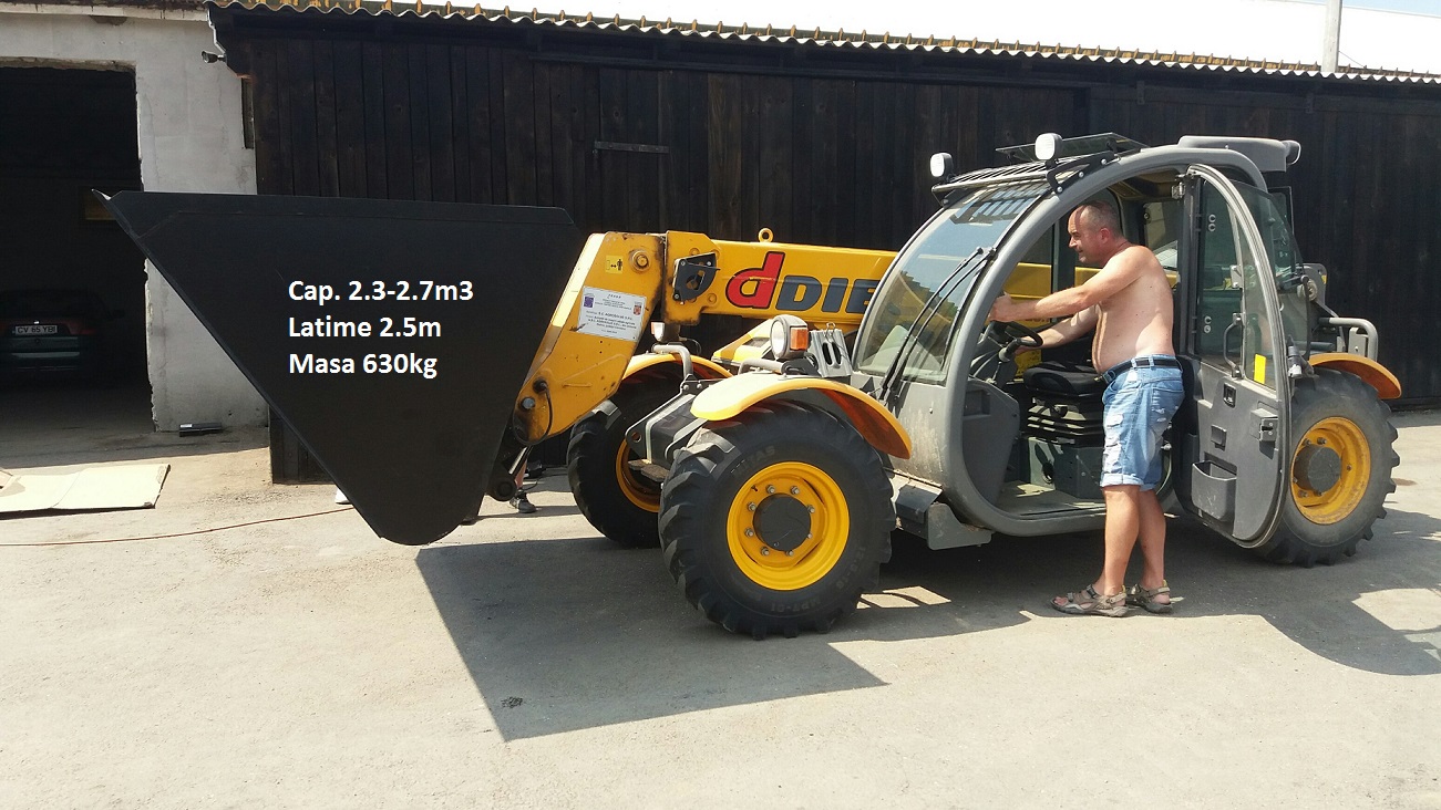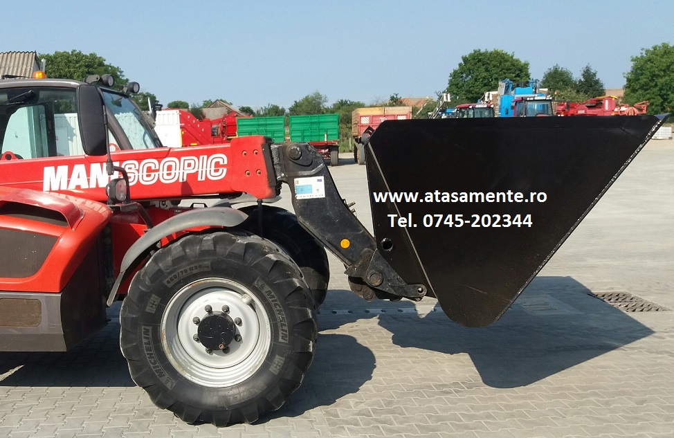 Fabricam la comanda cupa de cereale mare, cupa de materiale usoare, cu volum mare intre 2.5 m3 si 5.0 m3 cu prindere potrivita pentru orice marca si model de incarcator pe roti, articulat sau telescopic pentru a utiliza timpul de functionare al utilajului si consumul de carburant cu randamentul maxim offerit de puterea utilajului dv-stra. Cupele sunt echipate dupa preferinte cu lama de uzura suplimentara HARDOX prins in suruburi pentru a dubla - tripla durata de folosinta al acestuia.