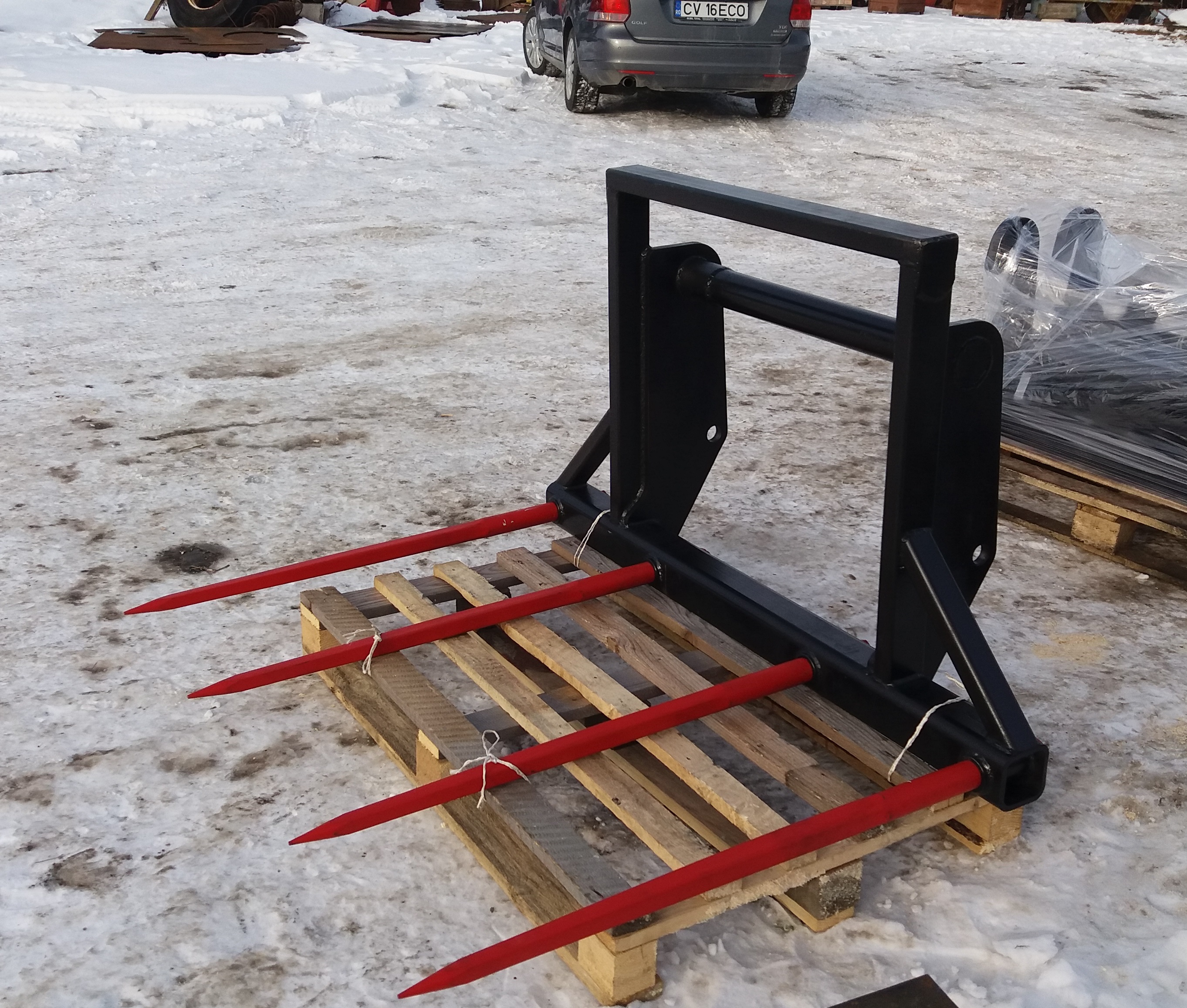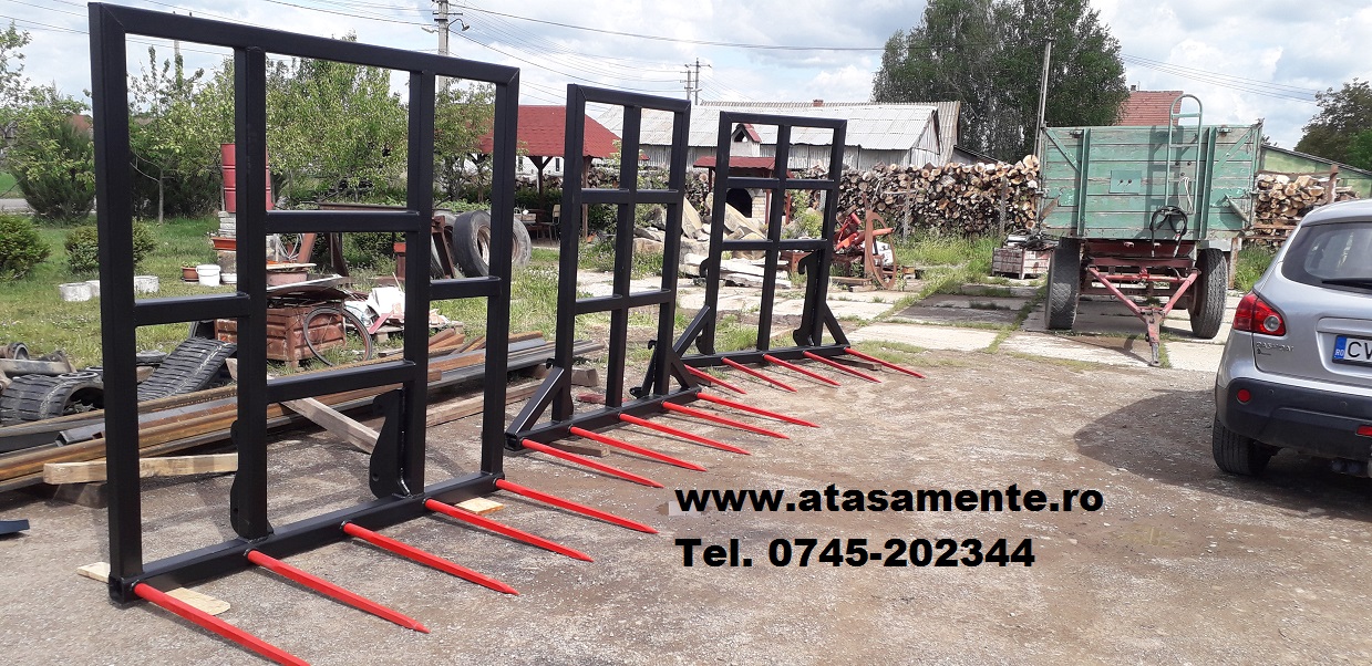 Va oferim furca de baloti Manitou, JCB, Merlo, Schaffer, Bobcat telescopic cu 2-3-4-5 tepuse, de latime 1.2 - 2m, cu rama de protectie inalt de 1-2m, putand transporta doi baloti cilindrici sau trei baloti dreptunghiulare avand sarcina utila de 2.5 tone
