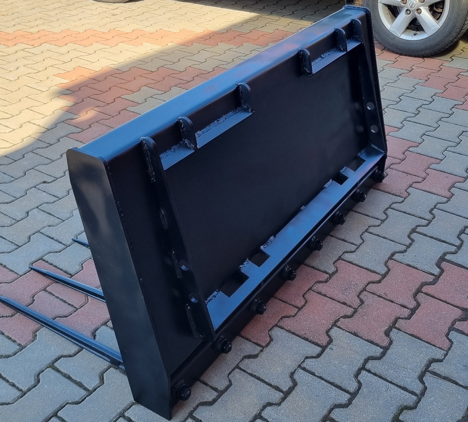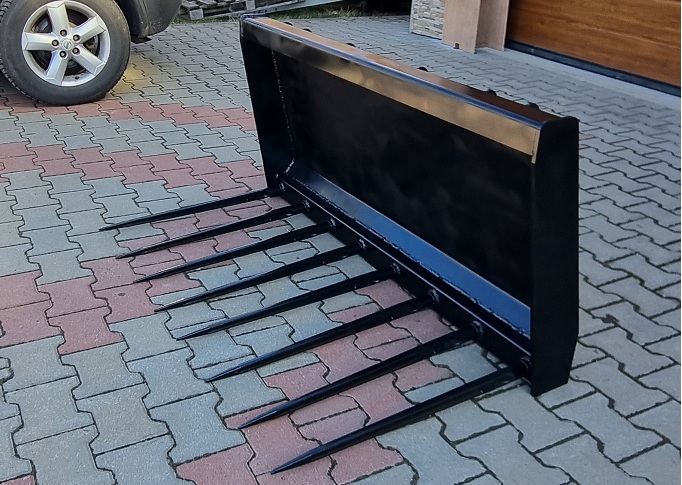 Va oferim de pe stoc, furca pentru gunoi de grajd cu prindere de mini incarcator potrivit la Bobcat, Komatsu, JCB Robot, CAT, Mustang, Gehl etc, proiectat si fabricat de noi, avand o structura de cel putin doua ori mai robusta decat cele chinezesti din comert, la care am folosit tabla indoita de 6mm grosime si laterale de 10mm grosime, cu 8 tepuse forjate in Germania, de 36x810mm, inaltime 70cm, latime 140cm, masa proprie 100kg.